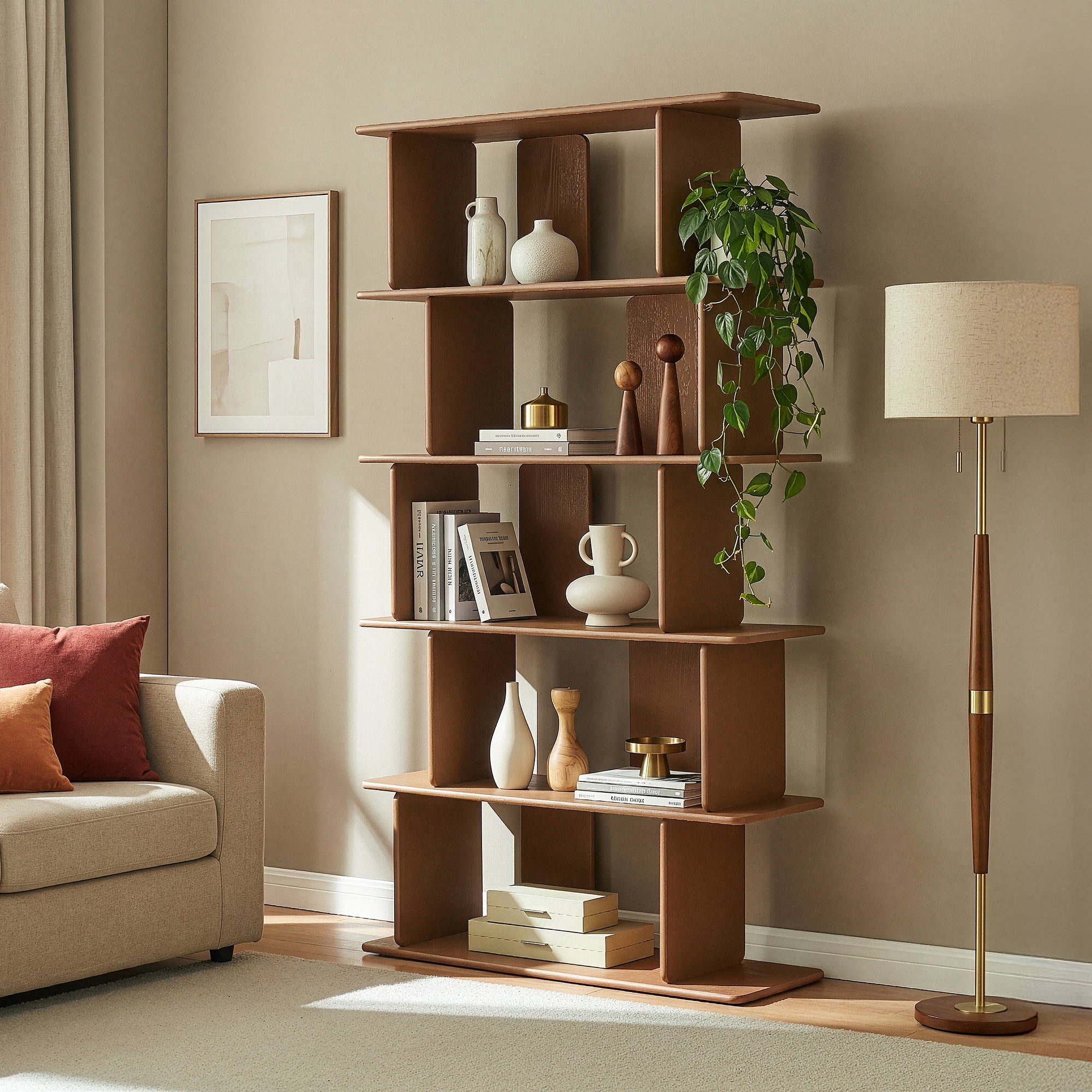 Die fünf versetzt angeordneten Regalfächer des Standregals bieten ausreichend Platz zum Verstauen von Büchern, Pflanzen und anderen persönlichen Schätzen. Durch die offene Gestaltung sind Ihre Lieblingsgegenstände stets griffbereit und gleichzeitig ansprechend präsentiert.