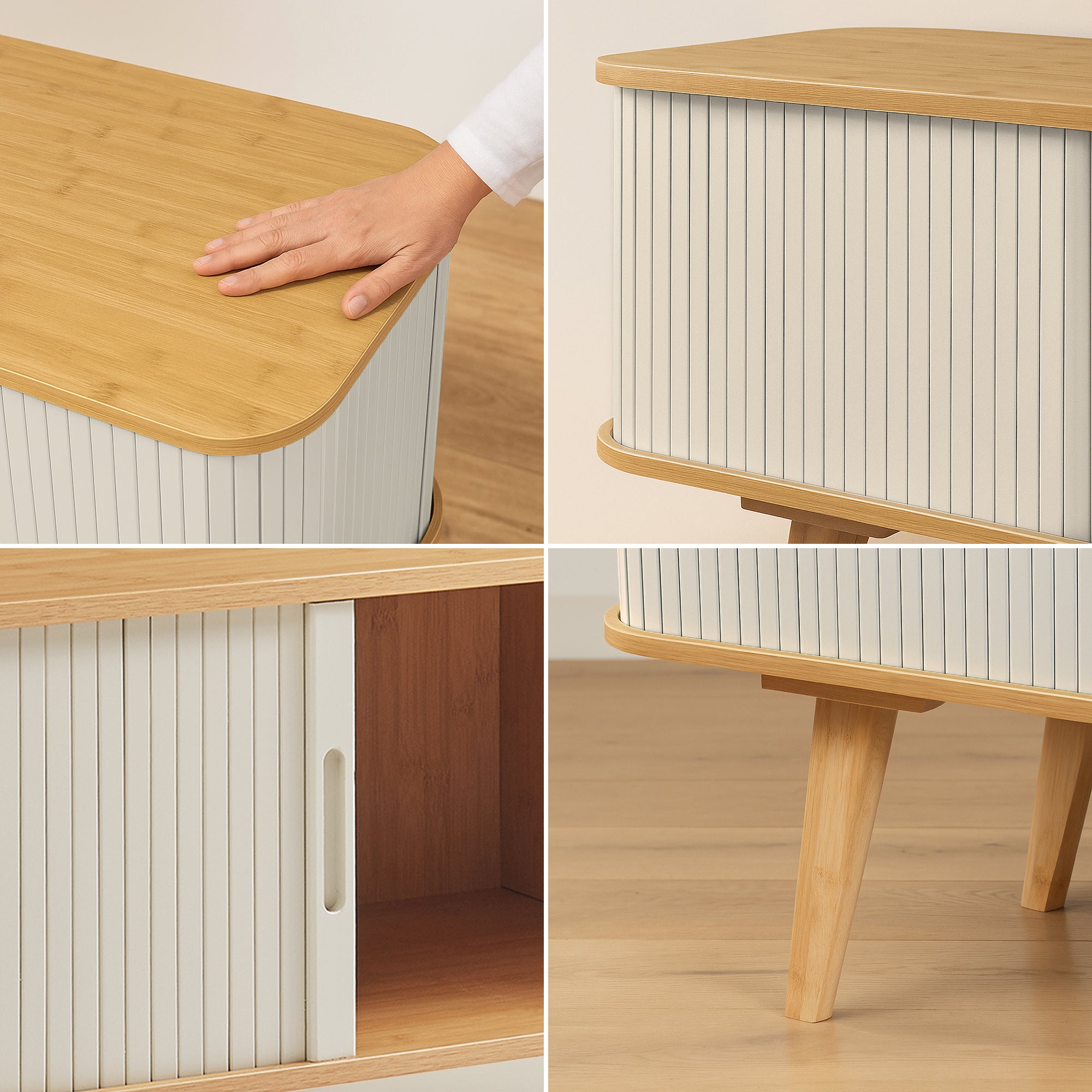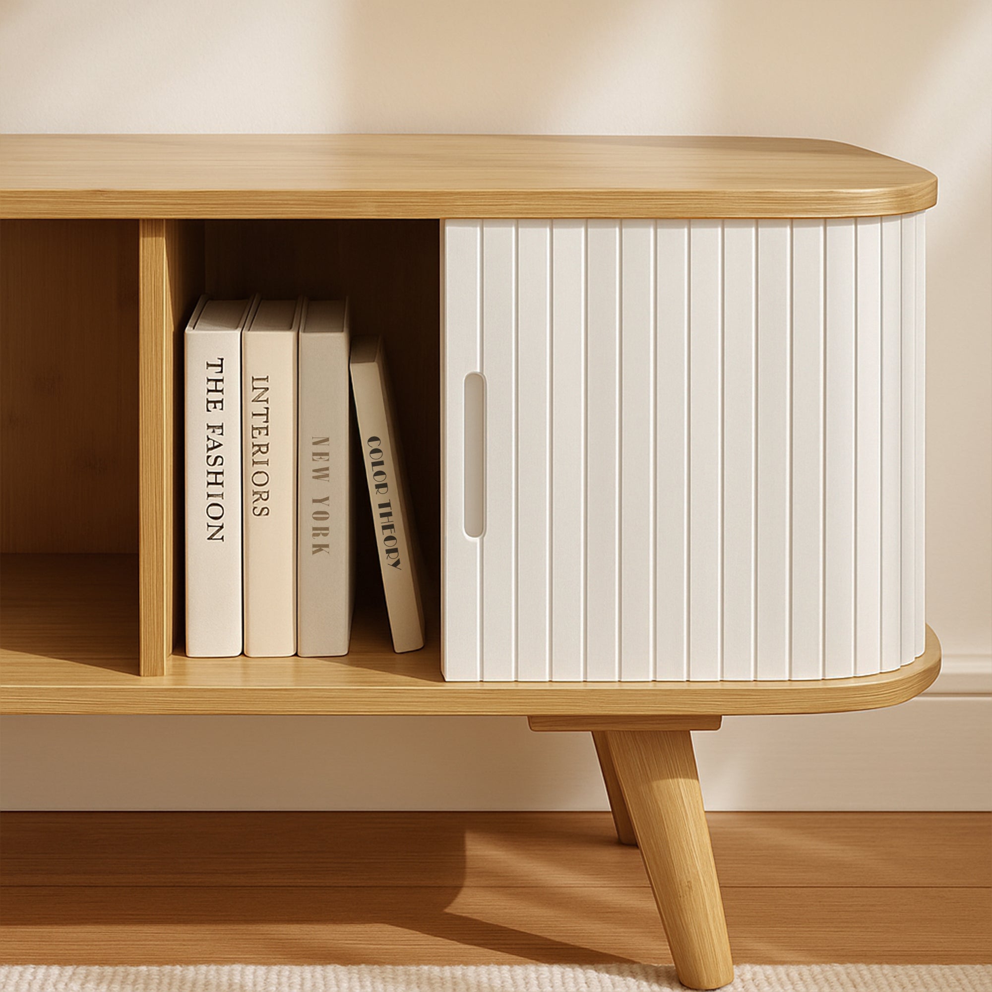Darüber hinaus verfügt der Tisch über zwei Schiebetüren, die mühelos geöffnet werden können. Im Schrankinnern lässt sich ausreichend Platz finden, um DVDs, Blu-rays oder Spiele für Ihre Konsole sicher zu verstauen. So haben Sie alles griffbereit und ordentlich organisiert.