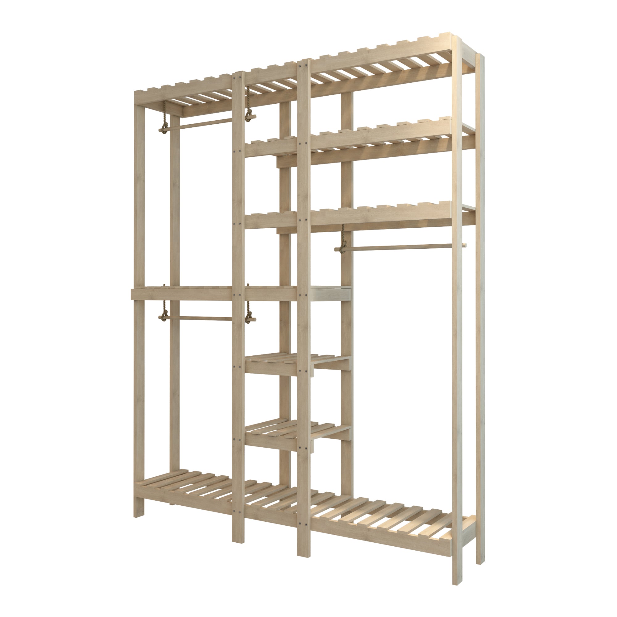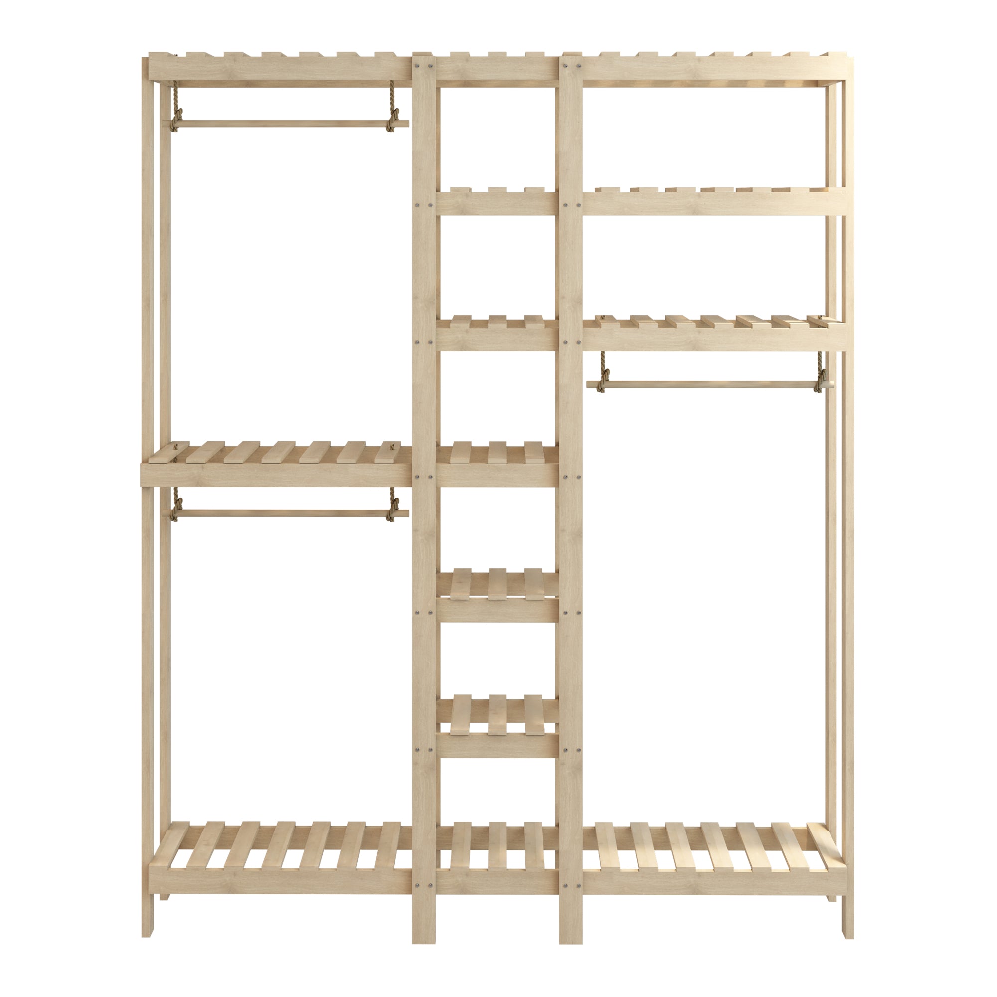 Der praktische und stabile Kleiderständer aus natürlichem Kiefernholz, lässt sich schnell und einfach aufbauen. Er verfügt über drei Garderobenstangen, sechs kleine Ablagefächer in der Mitte für T-Shirts oder Handtücher und zwei große Ablagefächer oben auf der rechten Seite für sämtliche Gegenstände. Die zwei großen, unteren Ablageflächen eignen sich bspw. ideal für Ihre Schuhe, während die Obere als Hutablage dienen kann.