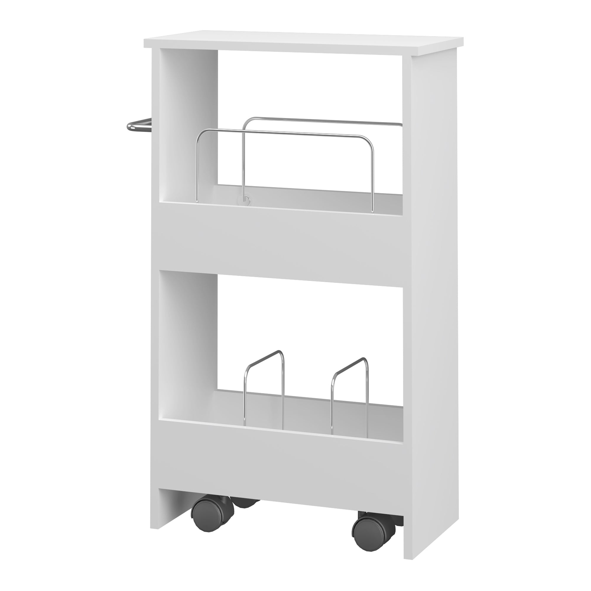 Die zwei Ablagen bieten ausreichend Platz für Speiseöl, Gewürze, Konservengläser oder andere Küchenutensilien, die Sie griffbereit haben möchten. Die integrierten Trennbügel in beiden Ablagefächern sorgen dabei für zusätzlichen Halt und verhindern, dass Flaschen oder Behälter beim Verschieben des Wagens umkippen.