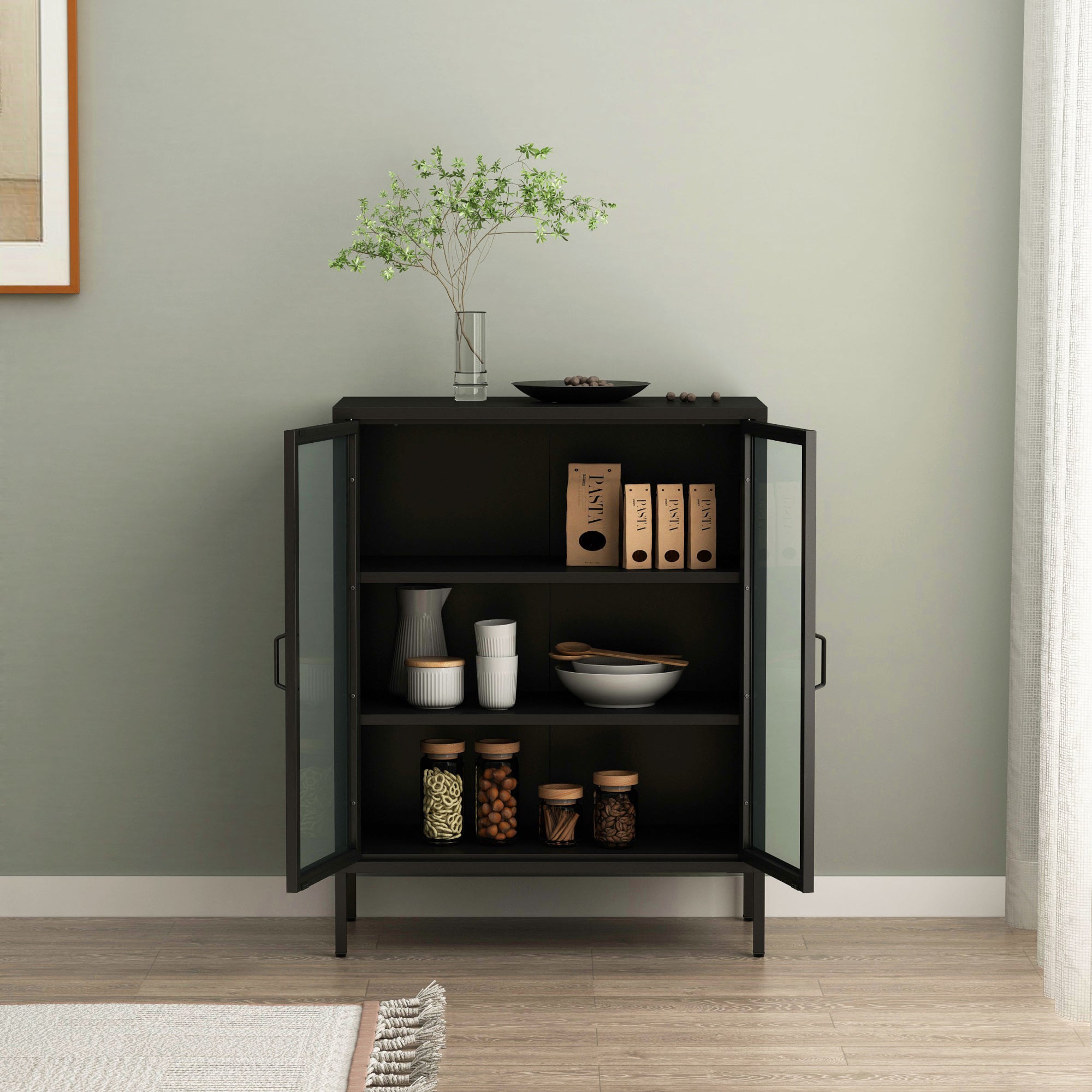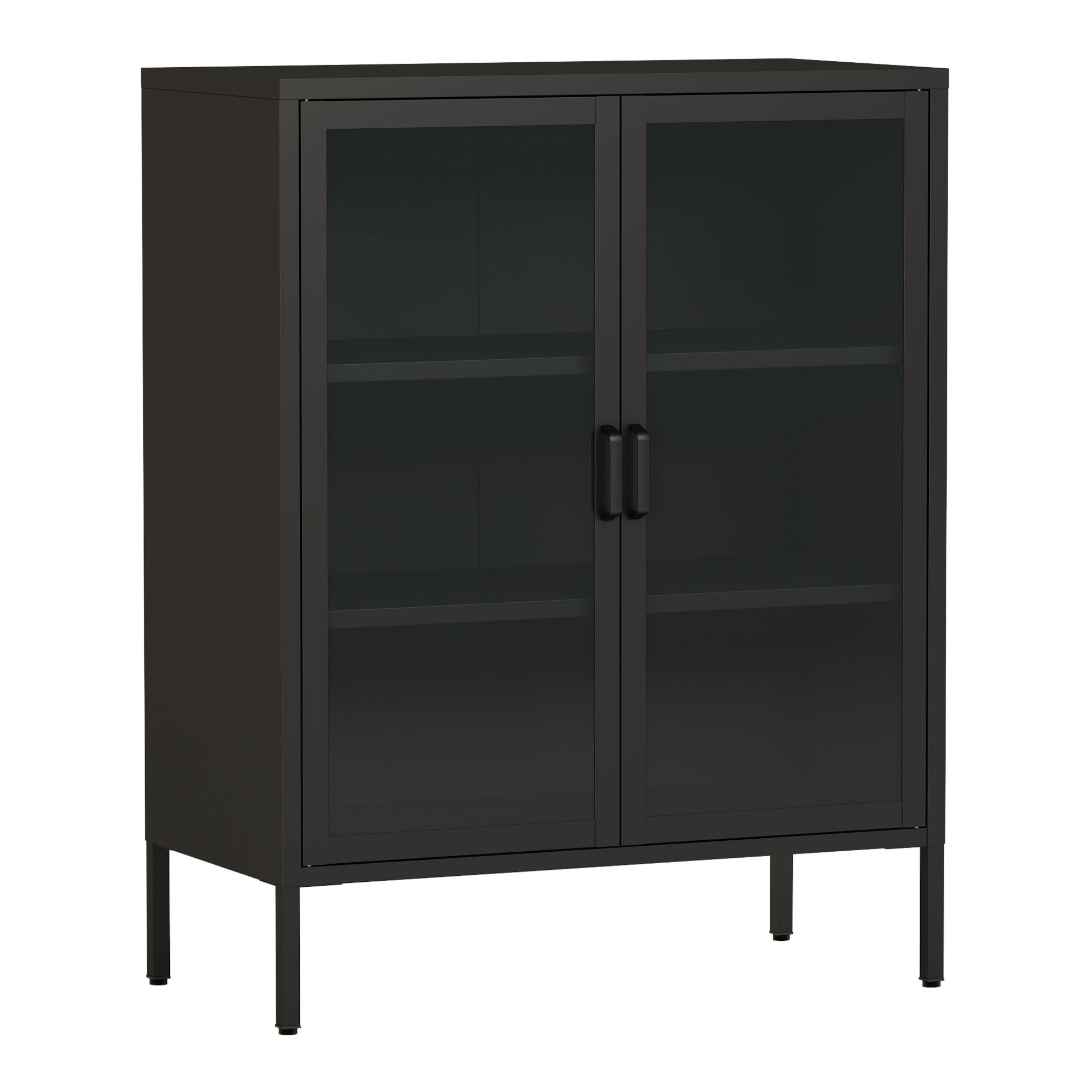 Der Wohnzimmerschrank ist ein stilvolles und praktisches Möbelstück, das Ihnen die perfekte Ergänzung für Ihren Wohnraum bietet. Er verfügt über zwei durchsichtige Glastüren und zwei zusätzliche Ablageflächen im Schrankinnern.